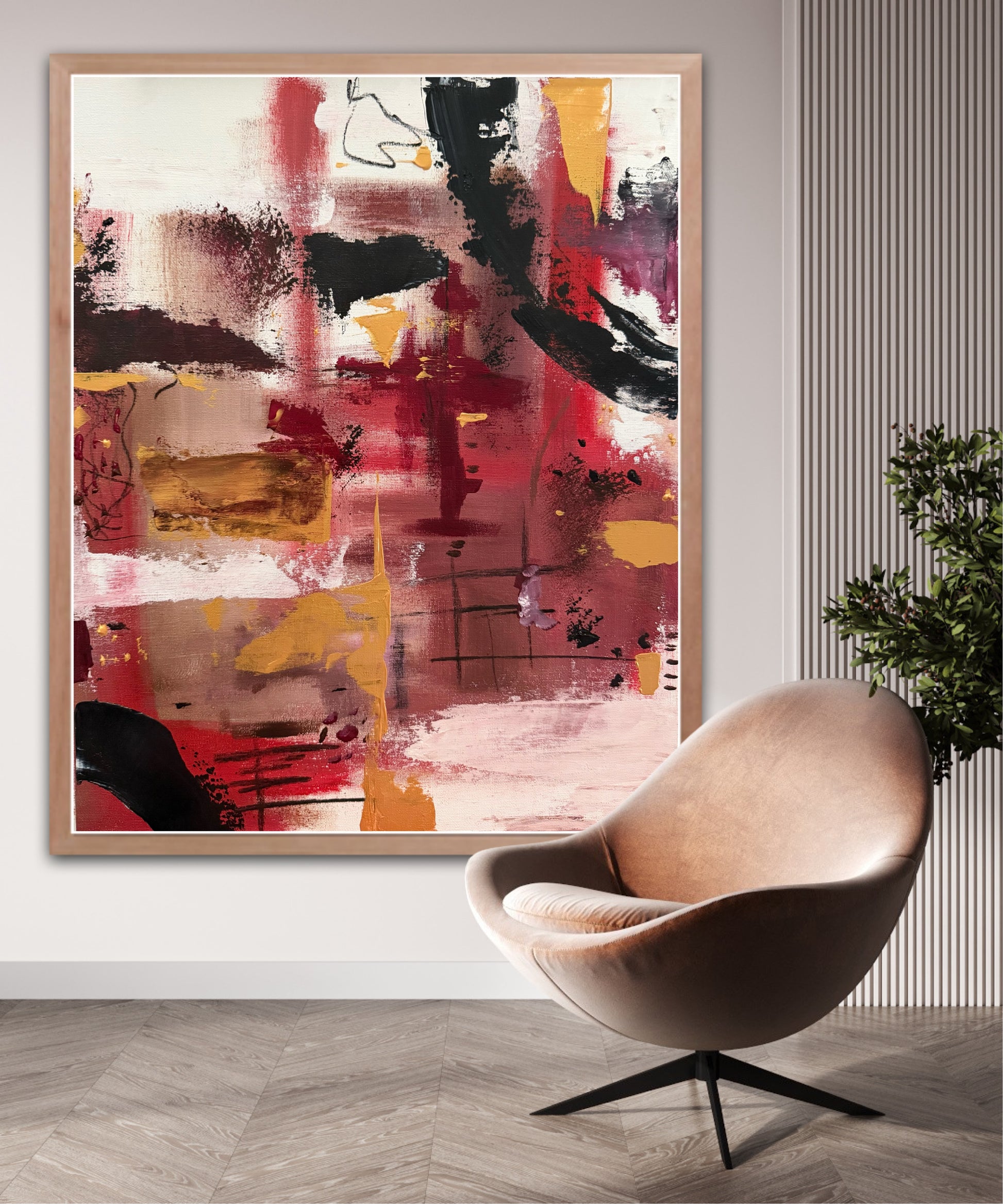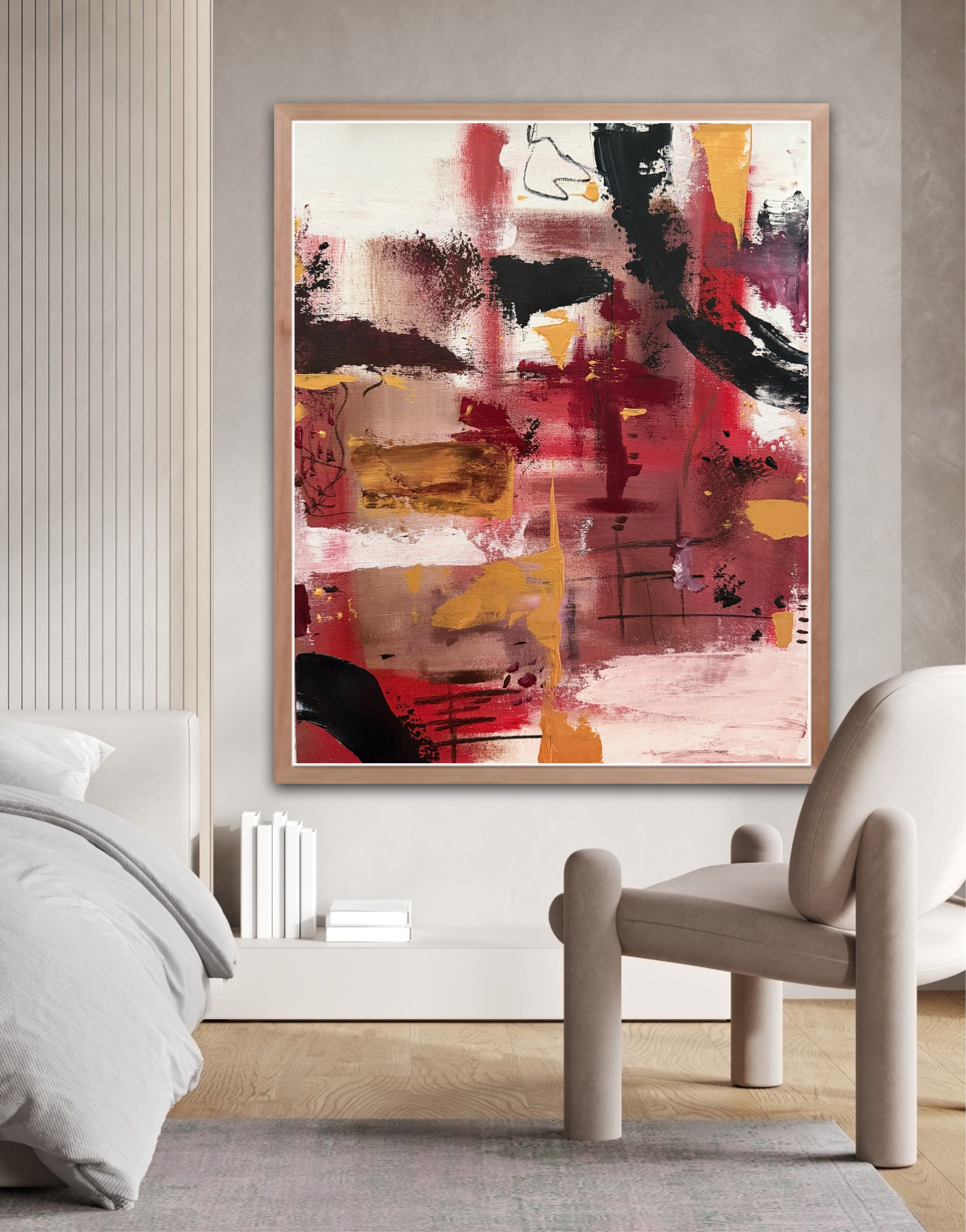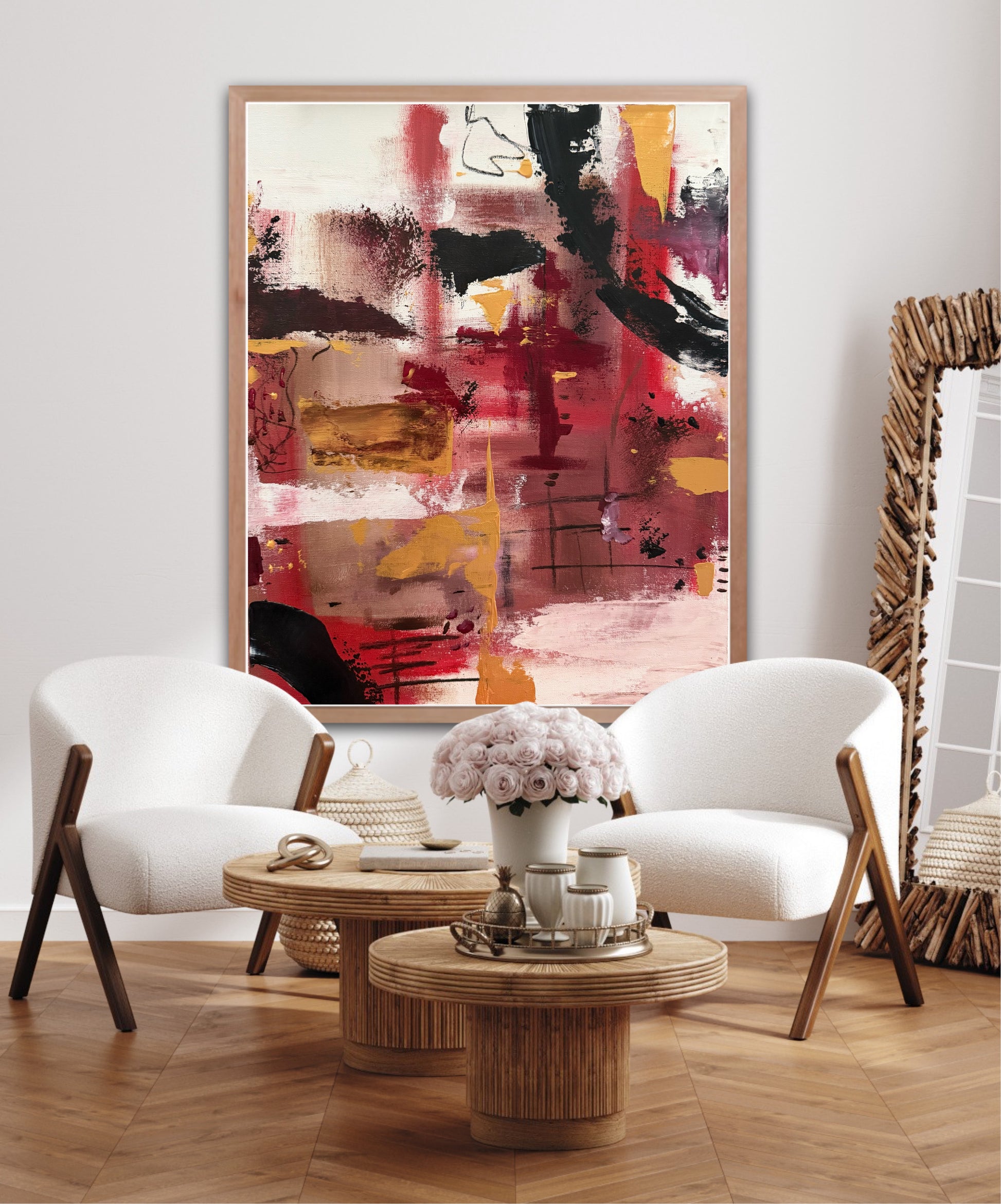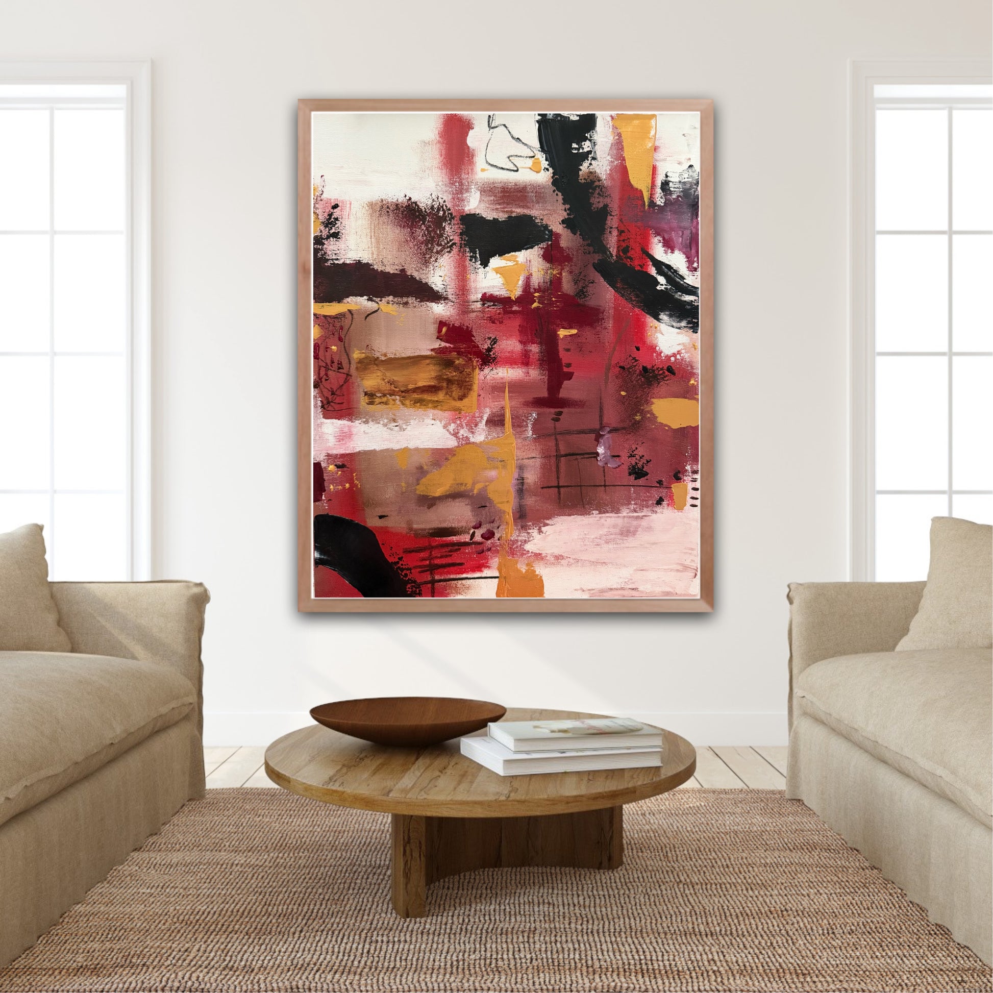 This abstract composition explores the quiet dialogue between conflict and calm. Layers of deep reds, softened neutrals, and restrained gold accents move across the canvas in deliberate tension, creating a sense of rhythm and emotional weight. Gestural marks and textured surfaces suggest moments of interruption and release, inviting the viewer to pause within the contrast. The work speaks to resilience, how strength and grace often coexist in imperfect balance.