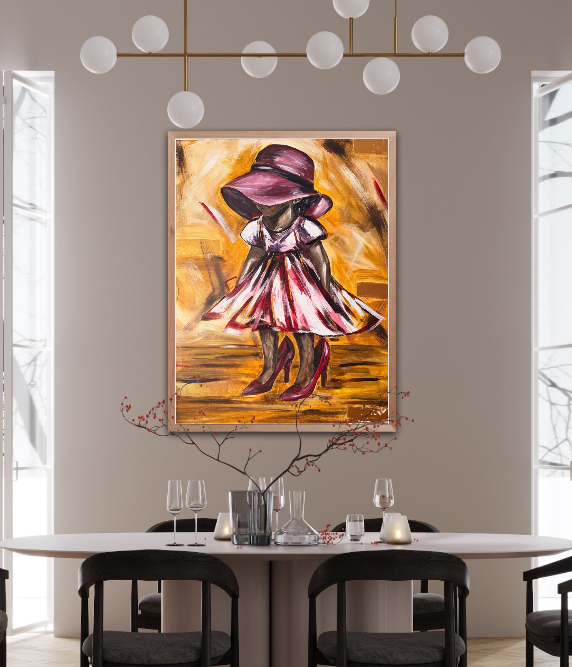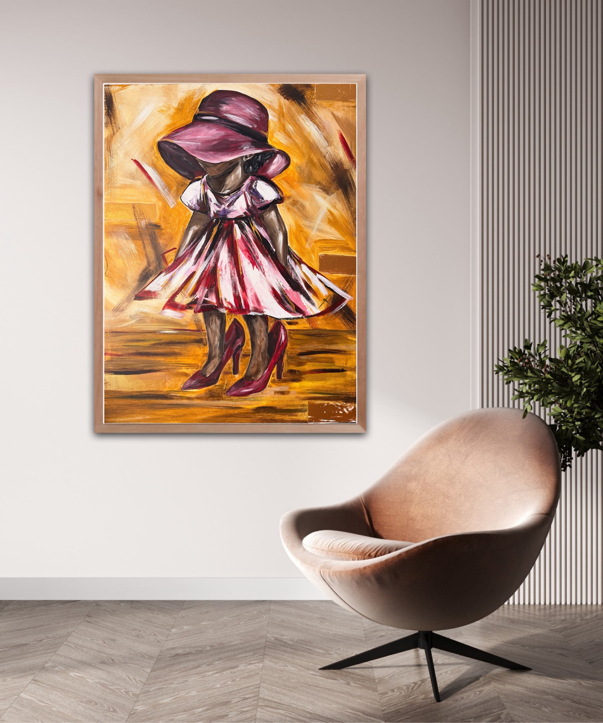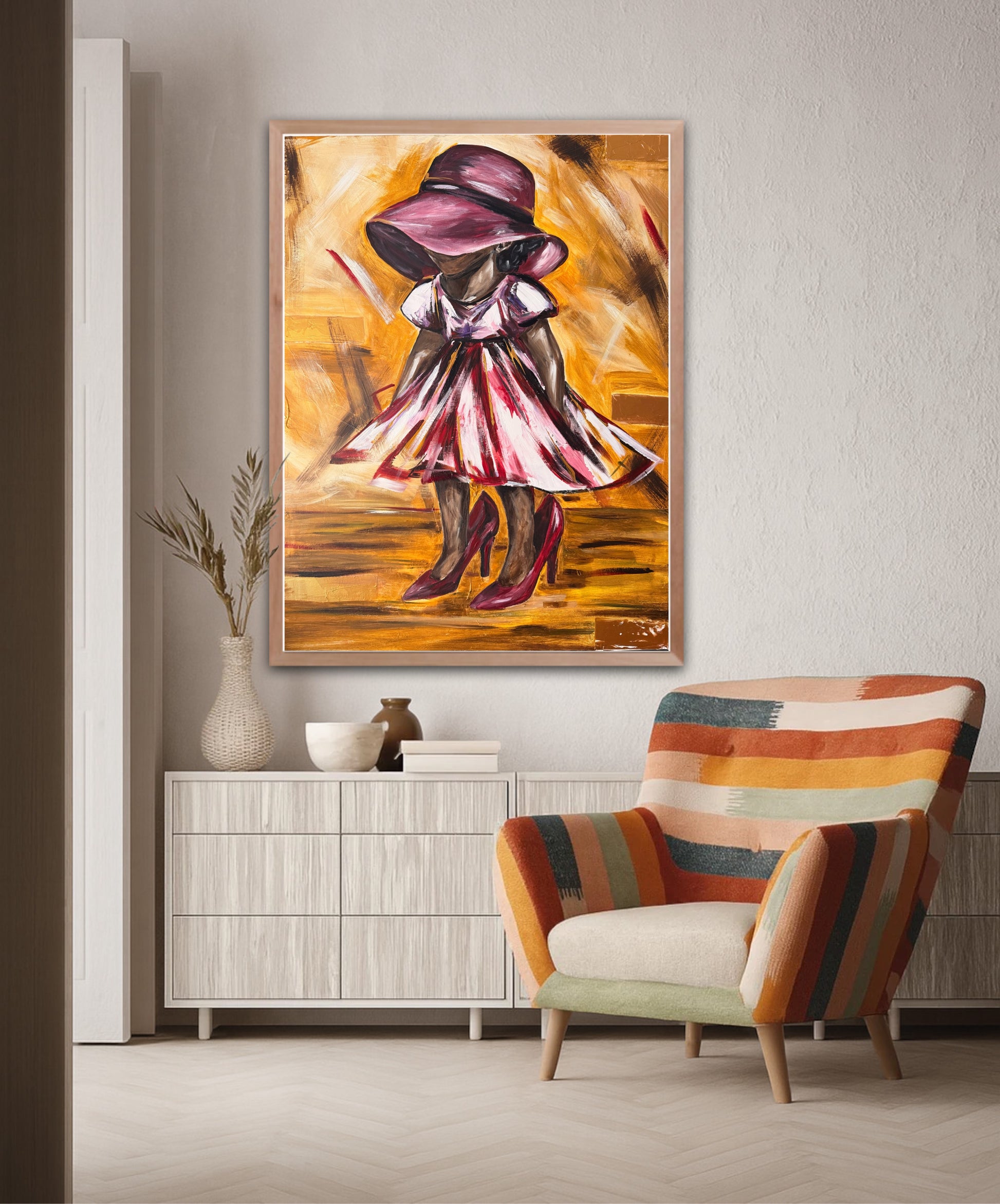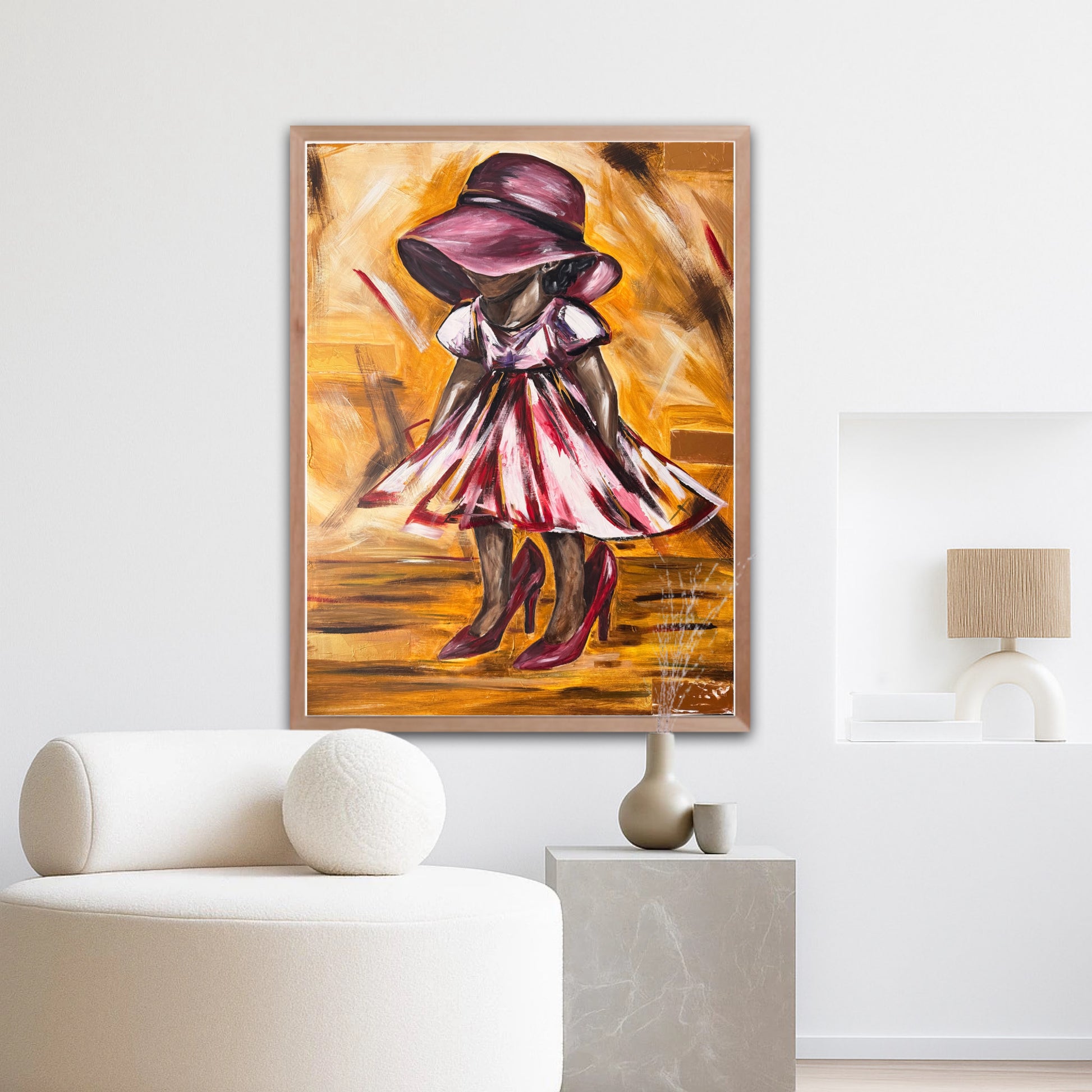 This painting captures the innocence of a child stepping into shoes far larger than her own, a tender metaphor for the journey of growth and the legacy passed down through generations. The oversized shoes symbolize the weight of responsibility, wisdom, and example left by parents, while the child's playful stance reflects both curiosity and courage. It is a reminder that every child walks a path shaped by those who came before them, and that in their small steps lies the unfolding story of the future.