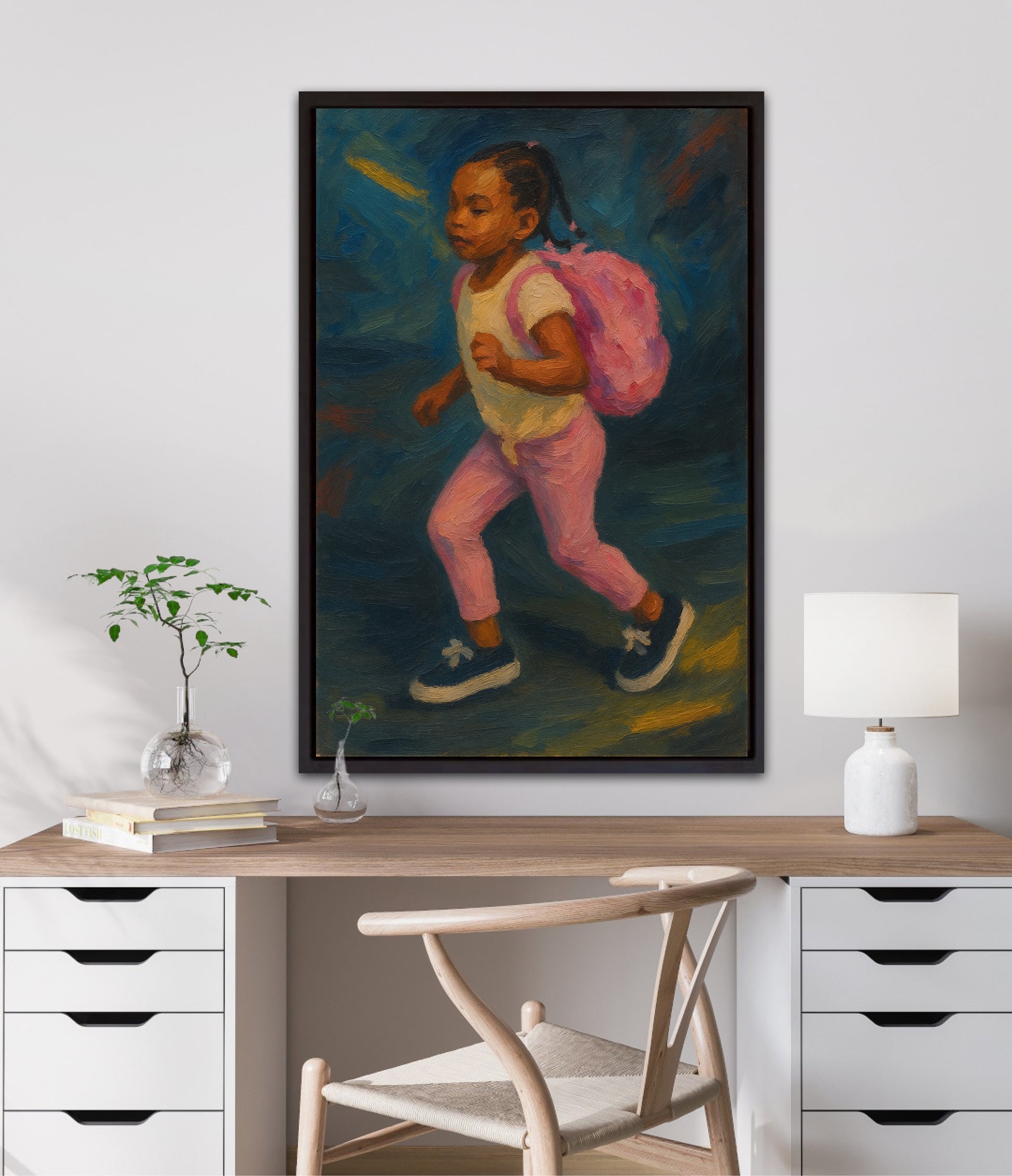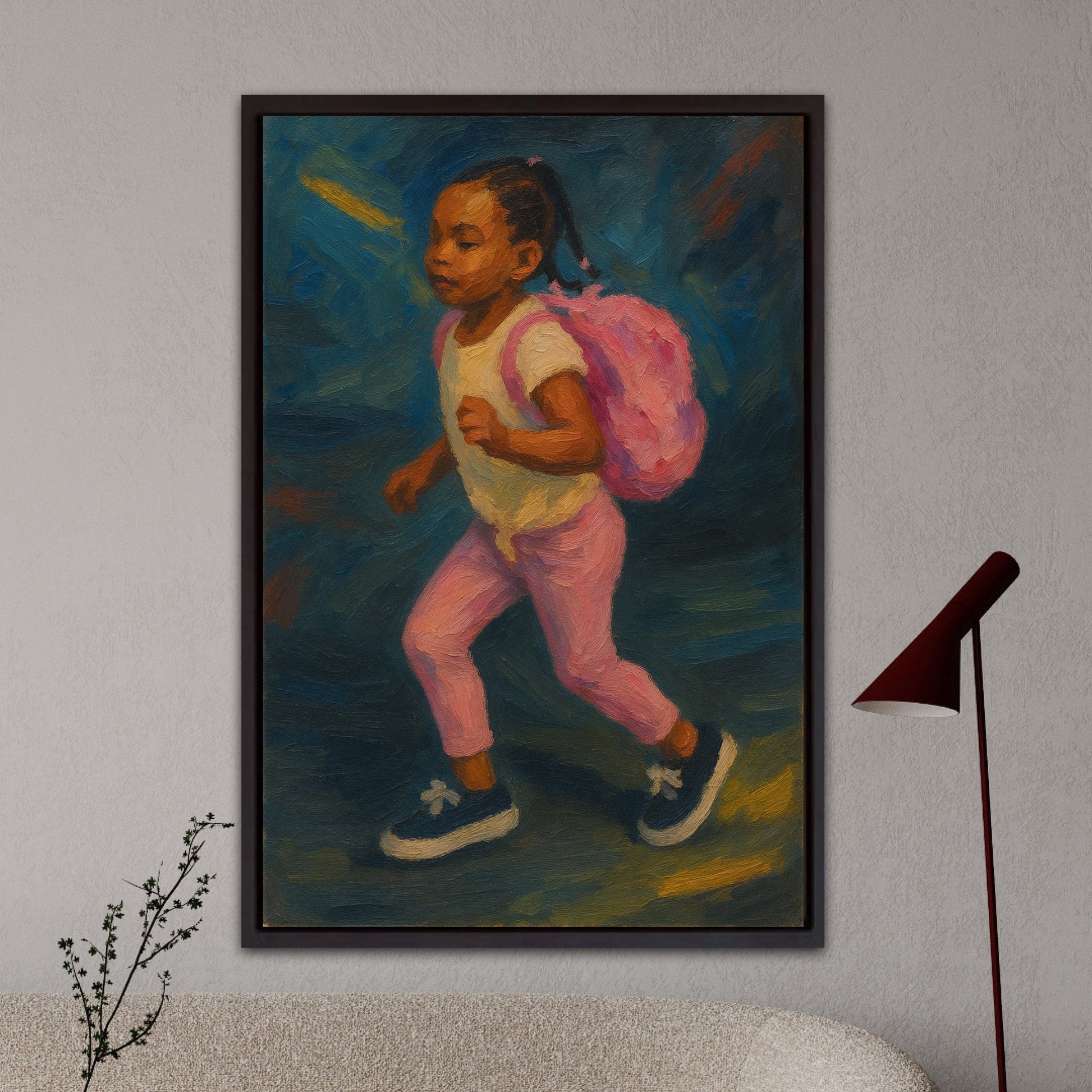 This painting captures the innocence and determination of a young girl as she moves forward with a sense of purpose. Dressed in soft pink tones and carrying a matching backpack, she symbolizes both childhood wonder and the courage to step into new beginnings.