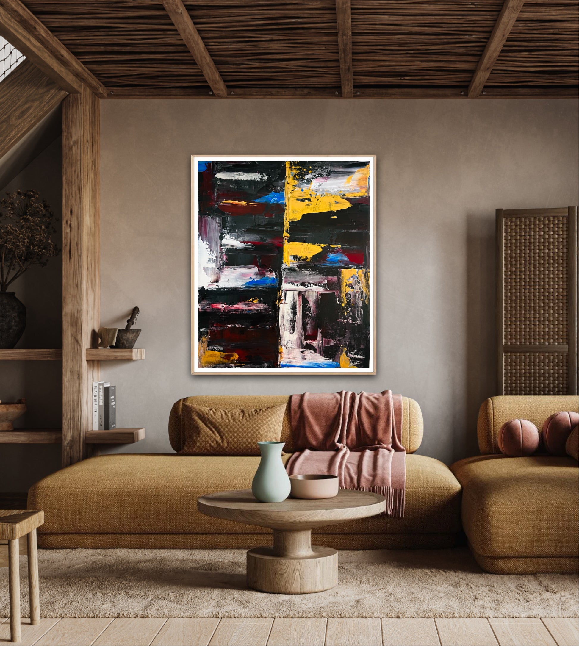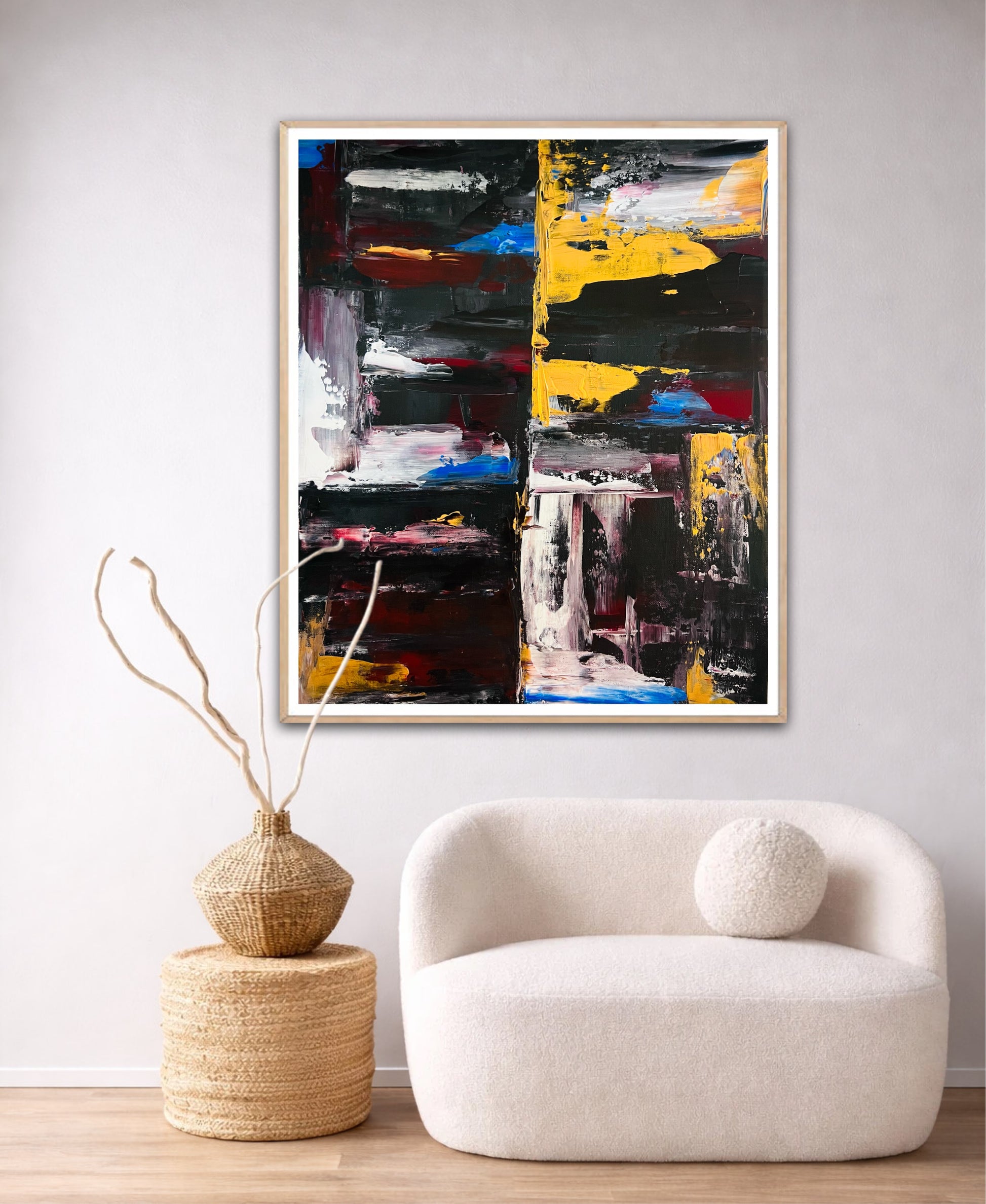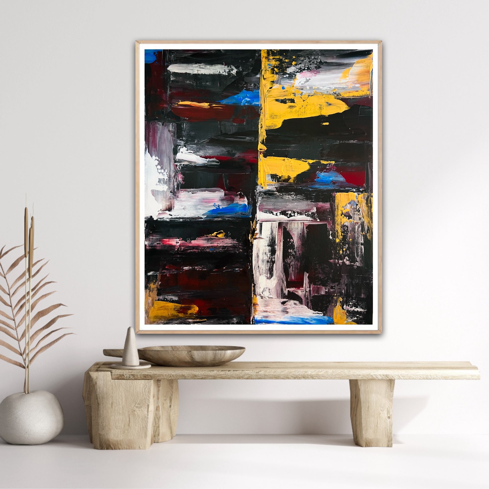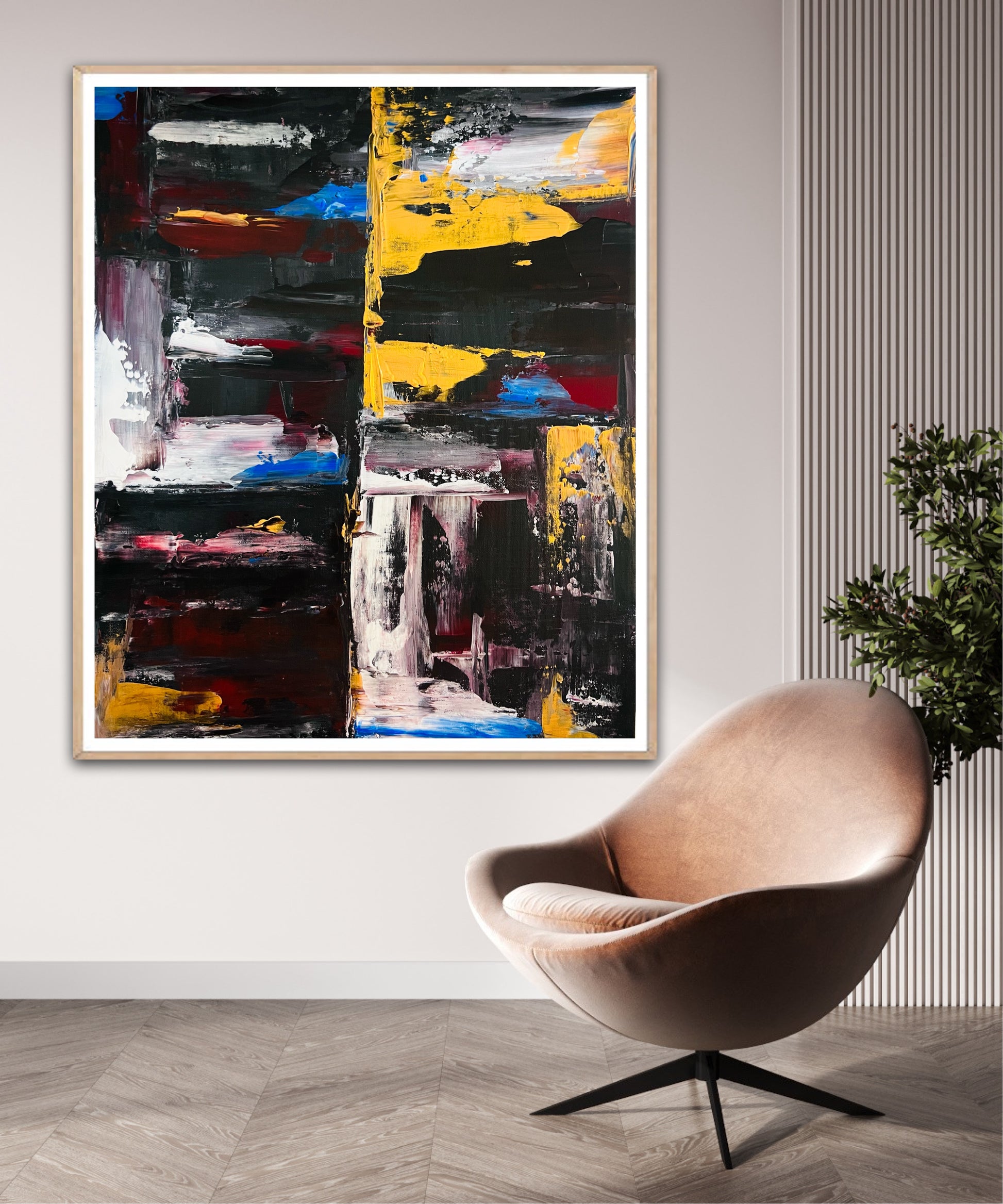 A restrained study of balance and force, where color and texture negotiate space without compromise.
