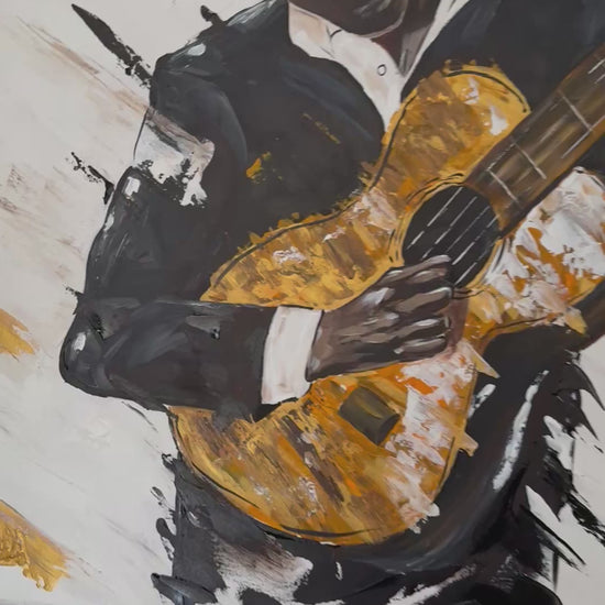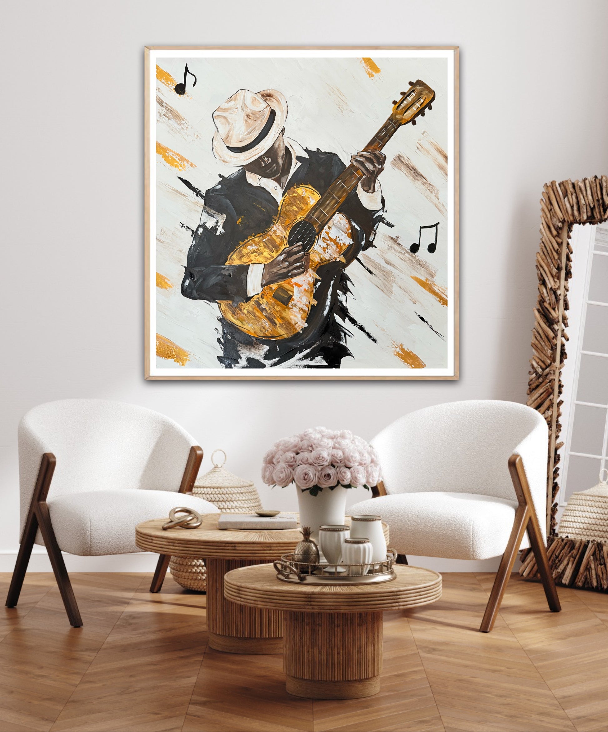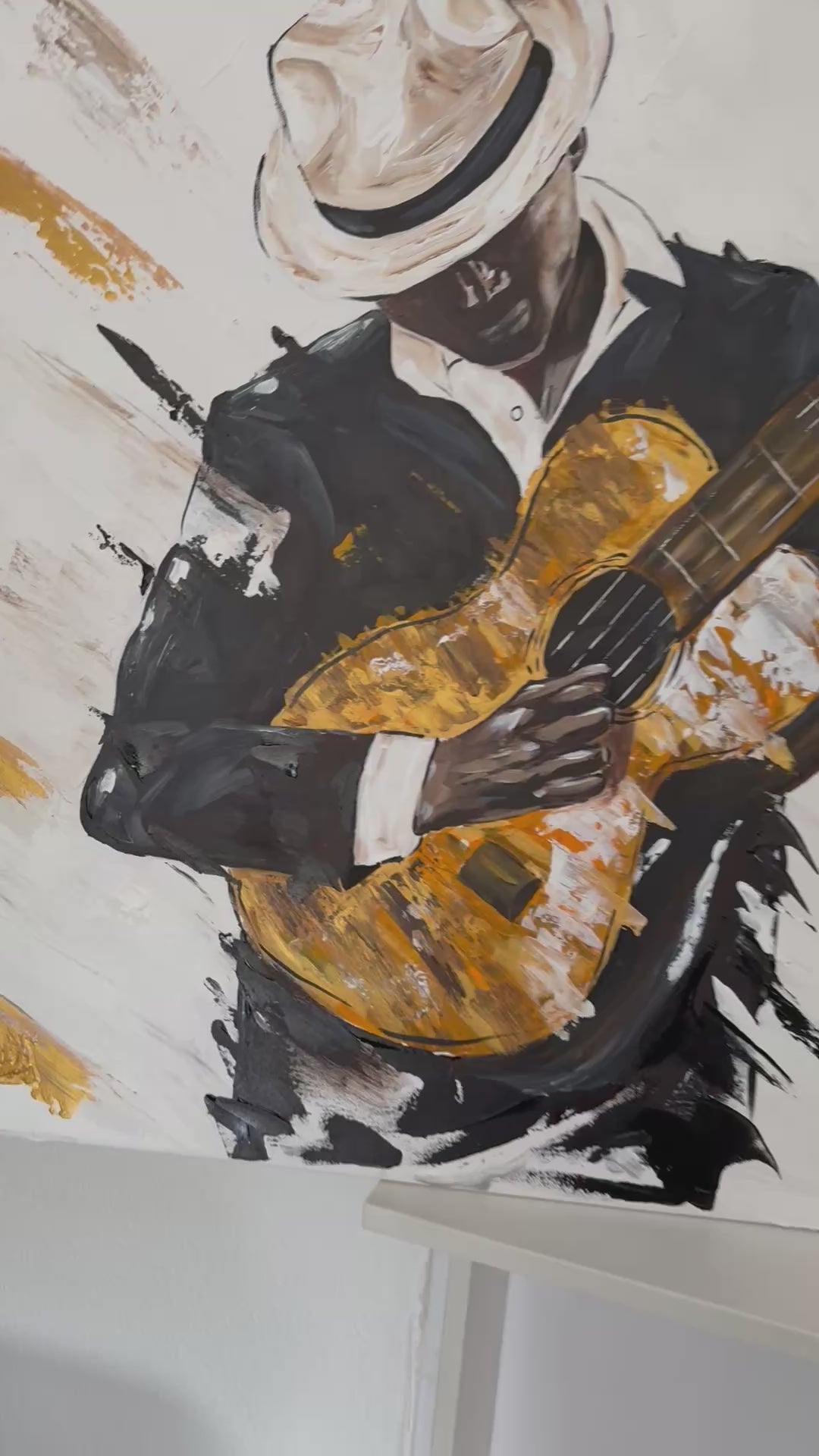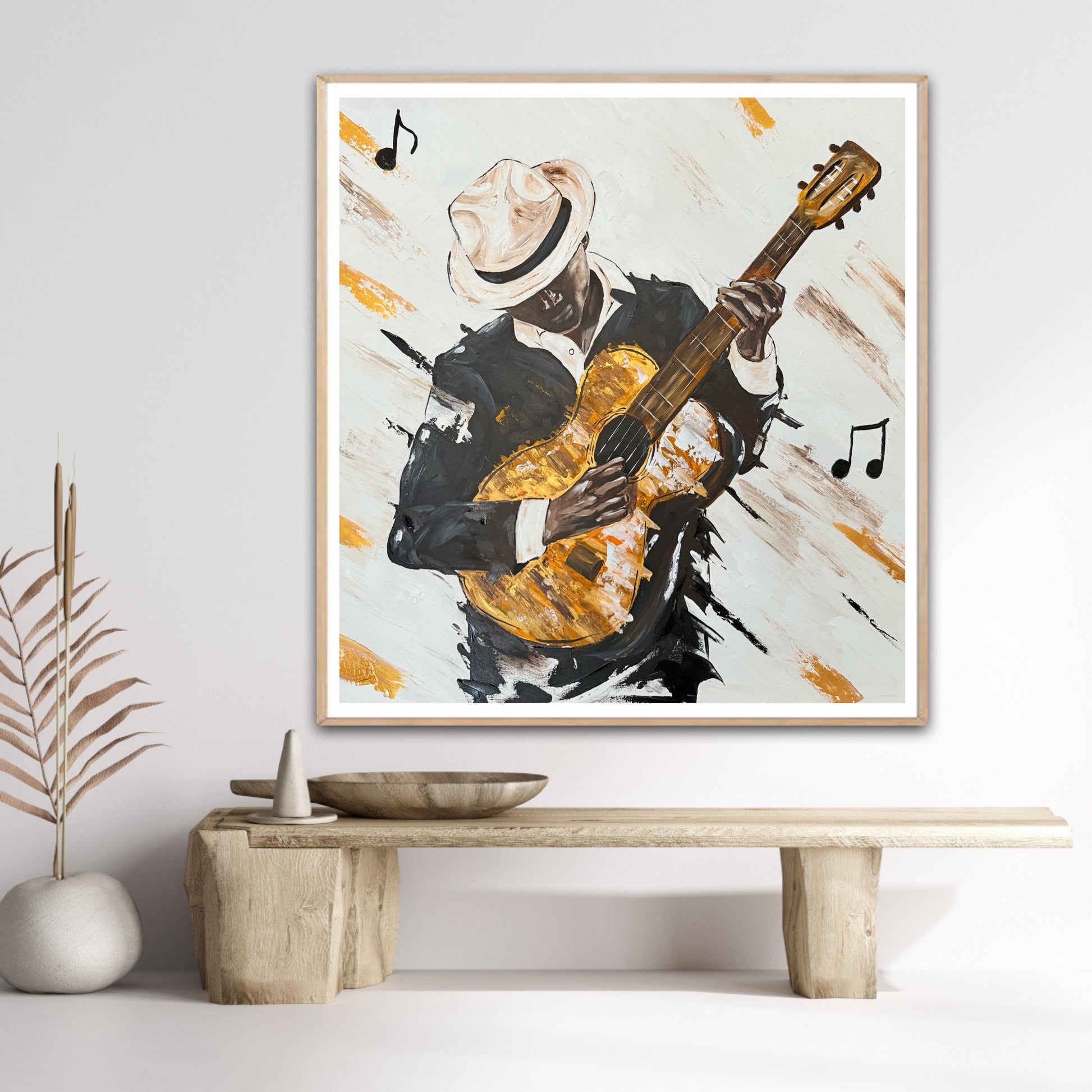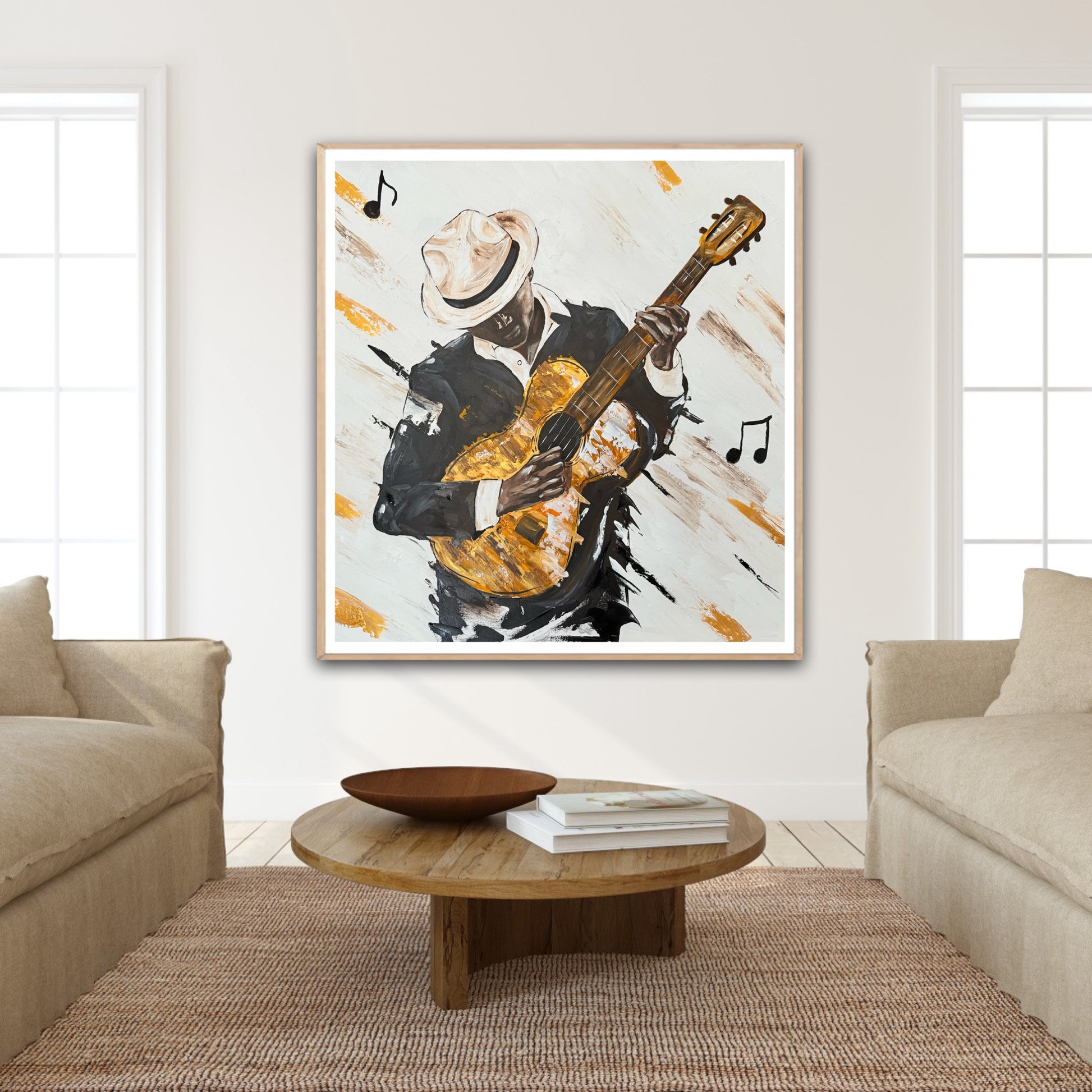 This painting portrays more than a musician. It is the embodiment of a man of valor. With faceless humility, he lets his guitar become his voice, spreading goodness, hope, and harmony to those who listen. The golden tones of the instrument symbolize the richness of his spirit, while the facelessness reminds us that true greatness is not in recognition but in the impact one makes. Like music flowing beyond walls, a man of valor spreads goodness beyond himself, leaving behind light, joy, and inspiration. This artwork is not just a statement piece. It is a tribute to men who carry courage, character, and kindness wherever they go.