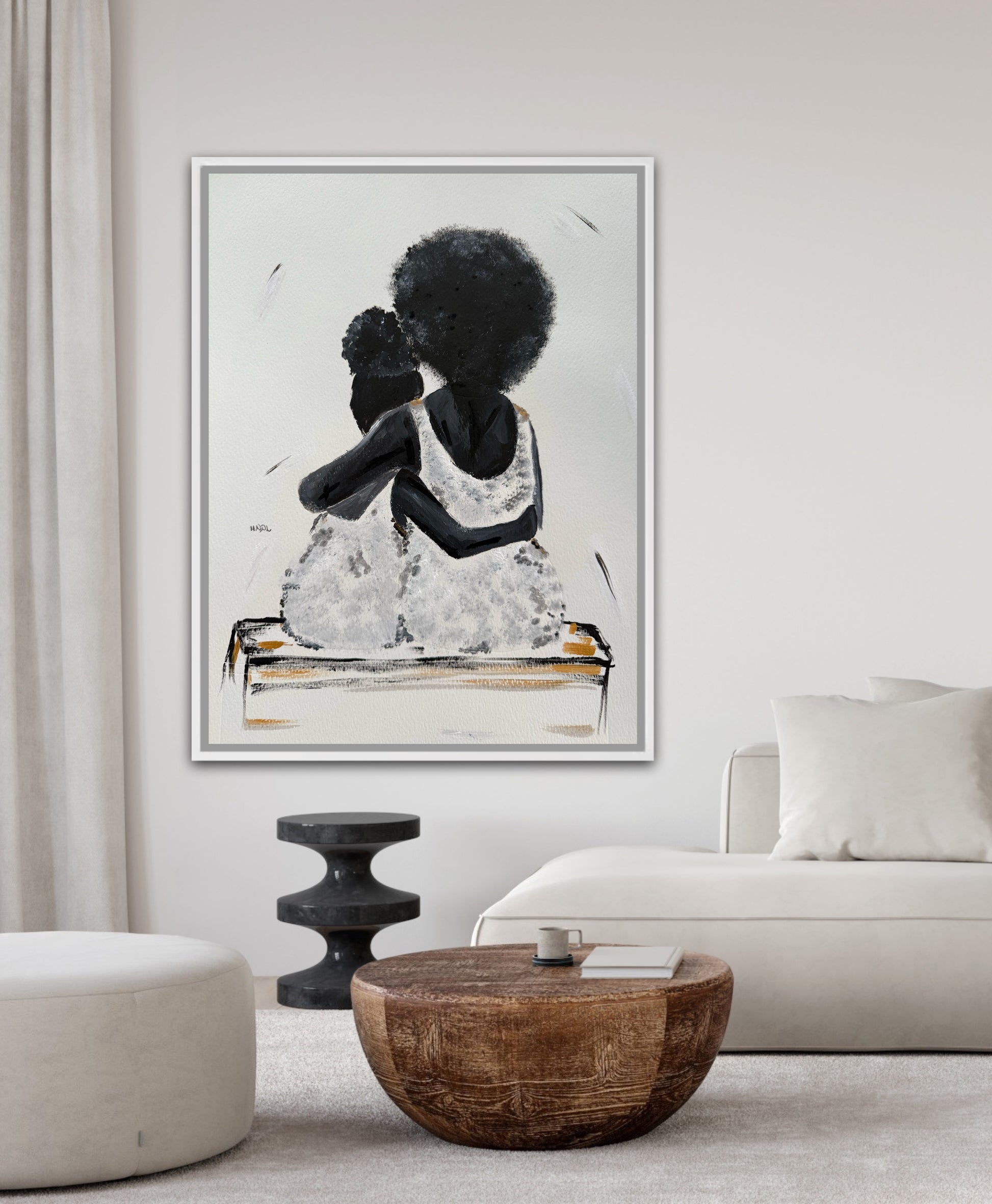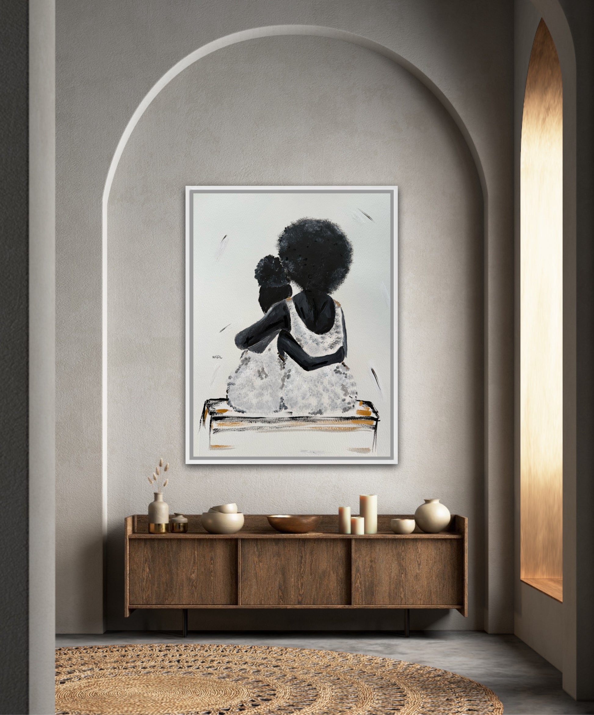 This painting captures a tender moment between a mother and her child, seated closely with their arms wrapped around each other in a quiet, comforting embrace. The soft textures and muted tones highlight the peace and safety found in a mother’s presence. Their faceless silhouettes are intentional, inviting viewers to see their own story reflected in the artwork. Without defined features, the moment becomes universal, allowing anyone to connect with the emotion of love, protection, and closeness shared between a mother and her child.